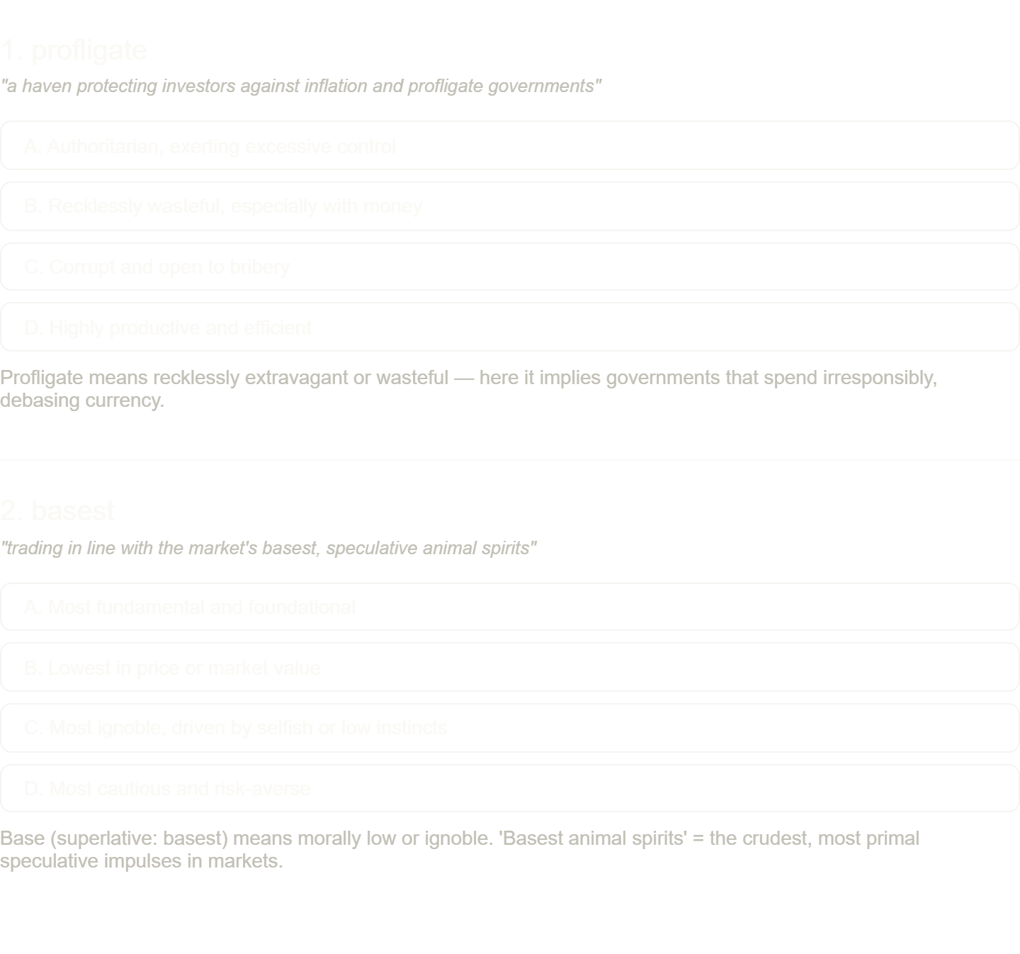 Yet neither rising real yields nor central banks’ sales fully explain gold’s recent behaviour. Another explanation of what is going on with gold is to think of it as becoming like the asset that was meant to replace it. Bitcoin was once heralded as “digital gold”—a haven protecting investors against inflation and profligate(recklessly extravagant or wasteful — here it implies governments that spend irresponsibly, debasing currency) governments, and insulated from the long arm of Uncle Sam. Instead it developed the unfortunate habit of trading in line with the market’s basest(morally low or ignoble. 'Basest animal spirits' = the crudest, most primal speculative impulses in markets), speculative animal spirits.